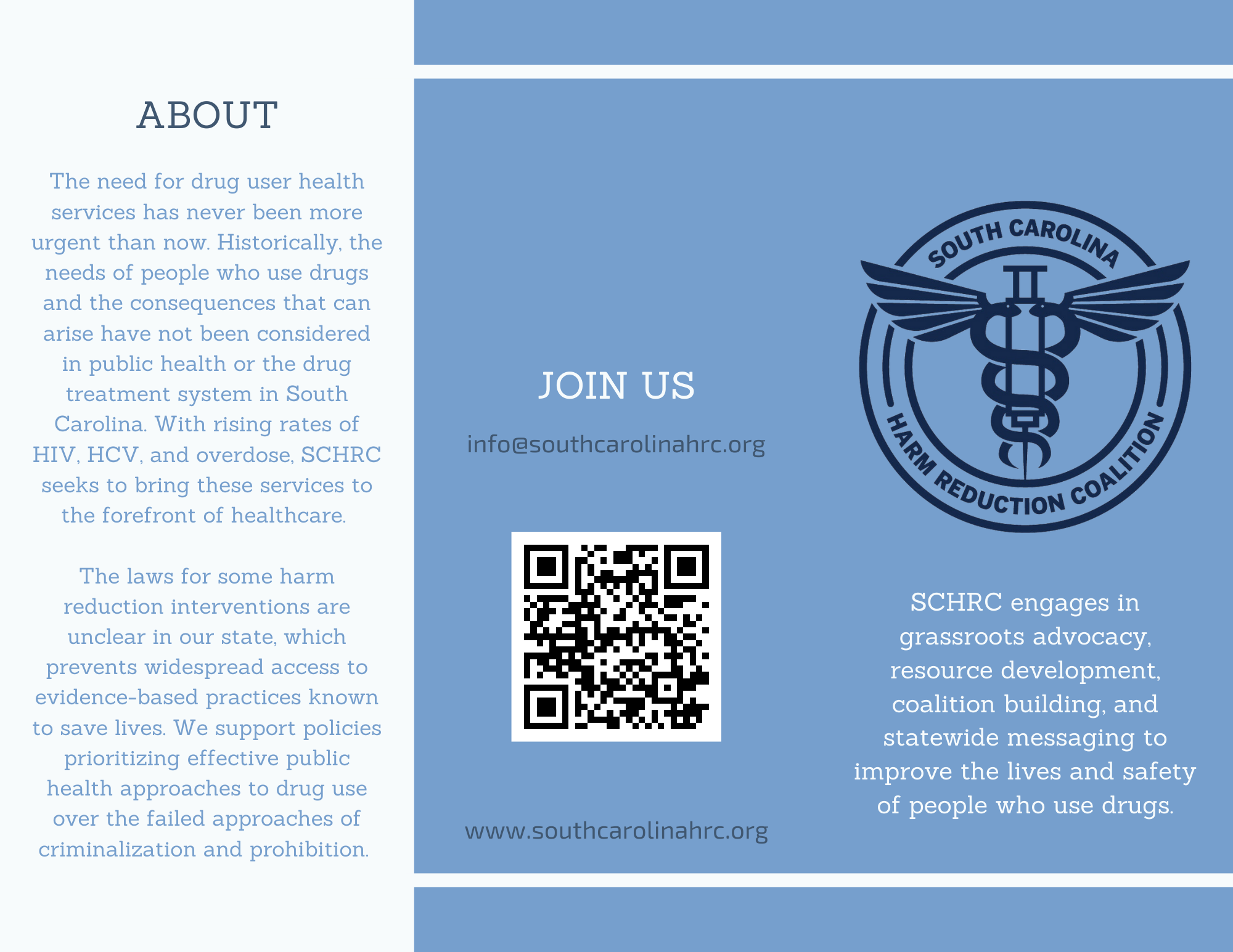 The South Carolina Harm Reduction Coalition engages in grassroots advocacy, resource development, coalition building, and statewide messaging to improve the lives and safety of people who use drugs. We offer guidance to other groups who may be interested in learning and implementing harm reduction interventions.